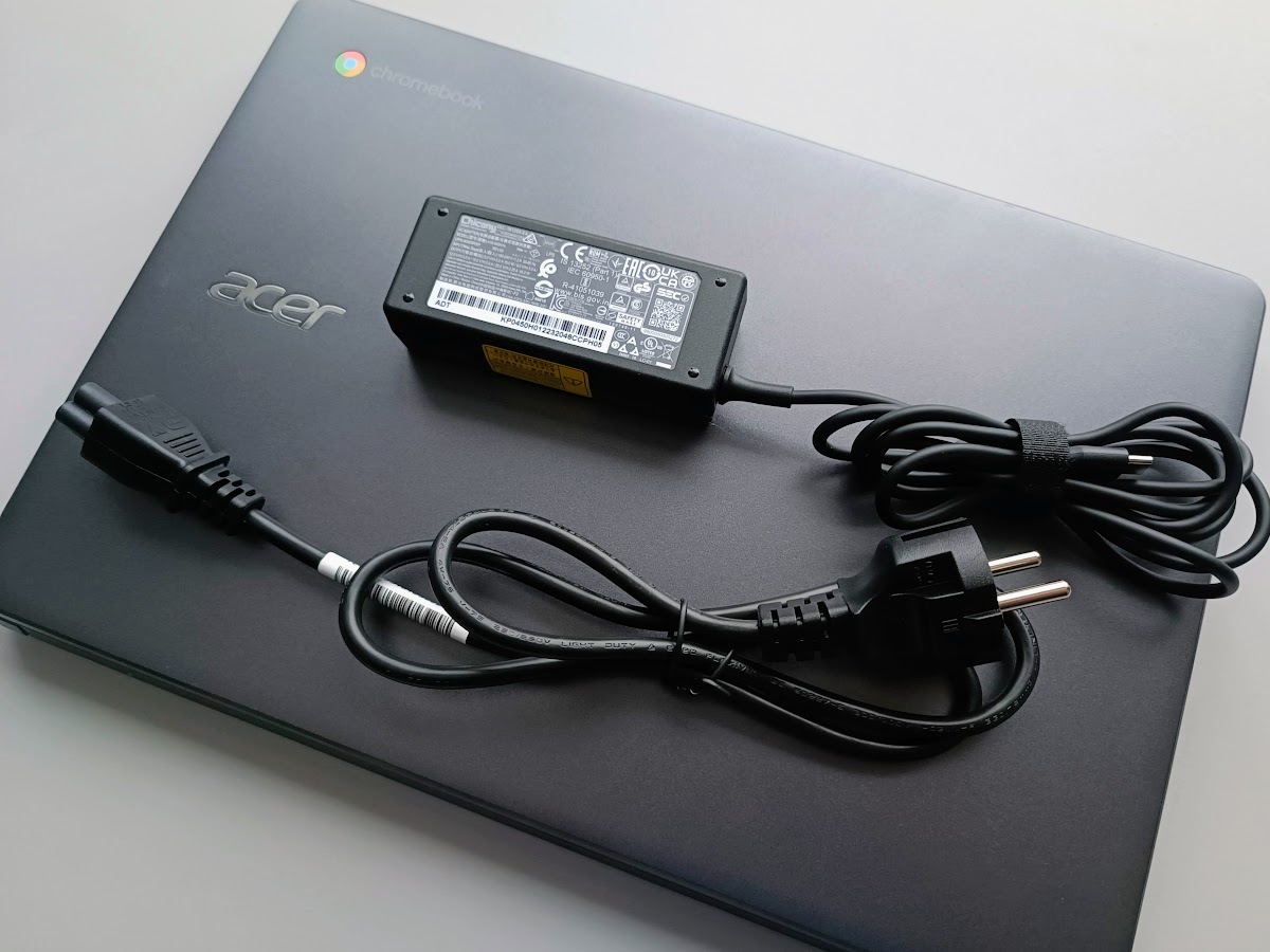Acer Chromebook 314 komplektā nekā diža nav – te ir tikai pats dators un USB Type-C uzlādes ierīce. Klēpjdatoru ir iespējams atvērt, bet cerams, ka skolā to neviens nedarīs. Ja nu vienīgi, lai ar skolotāja atļauju gūtu iespēju paskatīties uz datora iekšām. Te gan nekā daudz redzama vai maināma/uzlabojama nav.