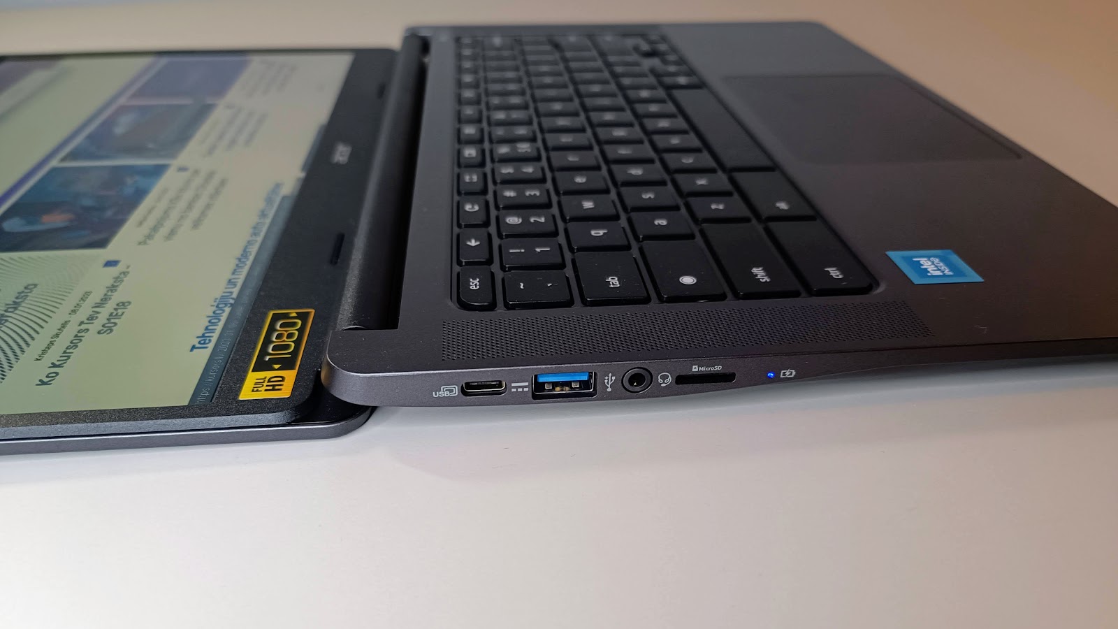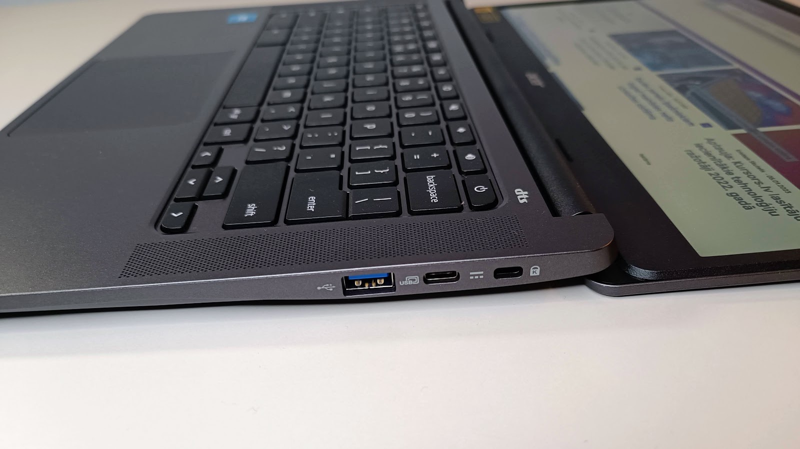 Pieķersimies uzreiz pieslēgvietām, jo parasti ar tām lētajos klēpjdatoros veicas ne pārāk labi. Bet šoreiz Acer Chromebook 314 ir divas USB Type-C pieslēgvietas (viena nodrošina 10 Gbit/s datu pārraidi un otra – 5 Gbit/s), šīs abas pieslēgvietas tad arī tiek izmantotas datora uzlādei. Tāpat te ir arī parastās USB Type-A pieslēgvietas – katrā pusē ir pa vienai Type-A un pa vienai Type-C pieslēgvietai, kas ir ļoti ērti. Tāpat te atradīsi microSD atmiņas karšu lasītāju un 3.5 mm austiņu pieslēgvietu. Tādējādi tas ir ļoti labs pieslēgvietu komplekts, īpaši ņemot vērā ierīces cenu kategoriju.