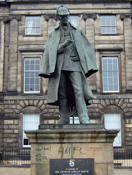 Foto: 1- rakstnieks. 2- rakstnieks ar sievu. 3- Šerloka Holms statuja Edinburgā Picardy Place, pretī mājai, kur 1859. gadā piedzima rakstnieks.