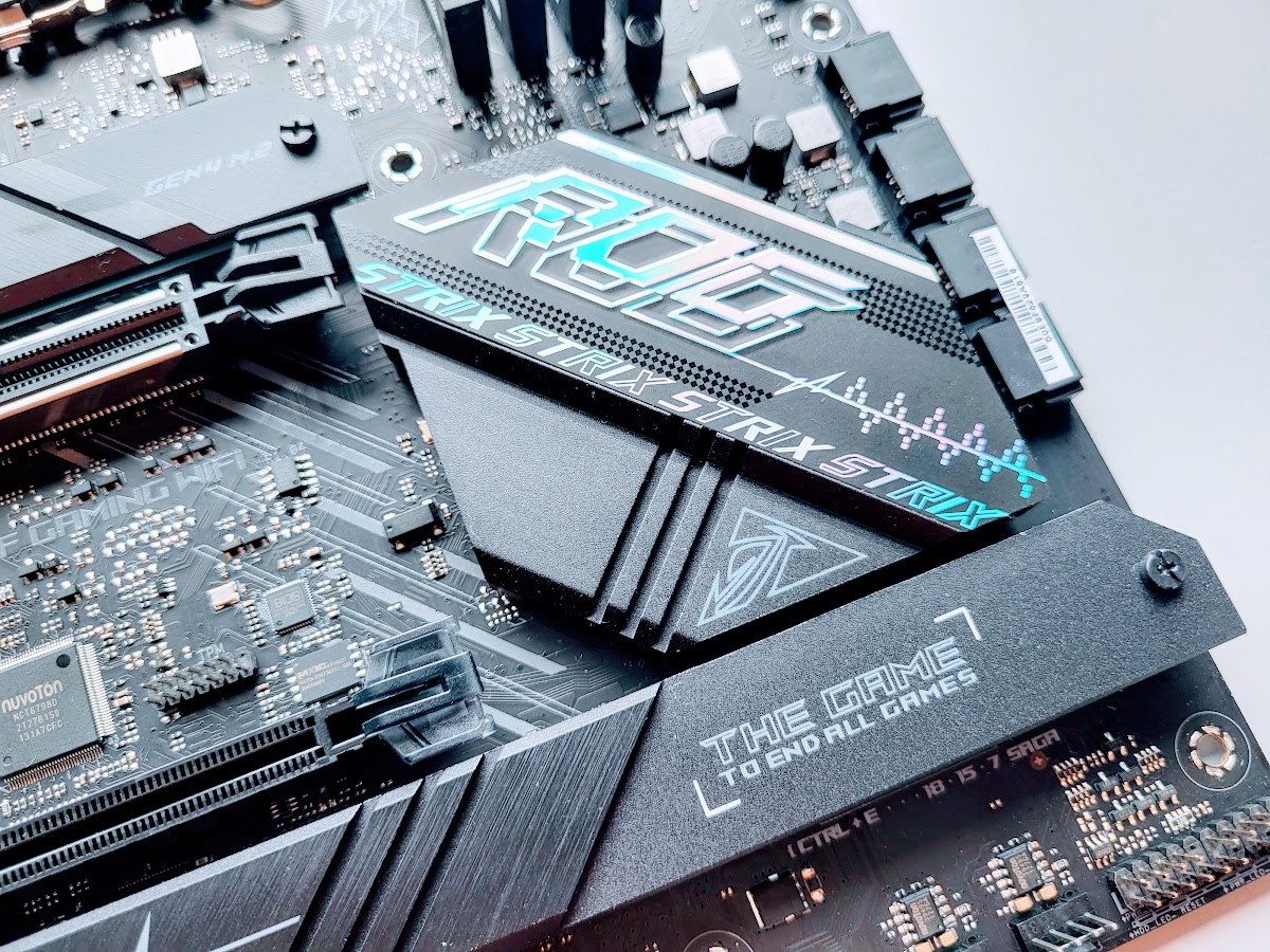 Uz sistēmplates ir vieta četrām operatīvajām atmiņām un trīs M.2 NVMe SSD tipa diskiem. M.2 NVMe SSD tipa atmiņas montējas zem spīdošā ASUS ROG logotipa. Sistēmplatei ir četras DIMM ligzdas, kurās varam ievietot DDR5 operatīvo atmiņu līdz 128 GB kopējam apjomam un sistēmplate atbalsta pat DDR5 6000(OC).