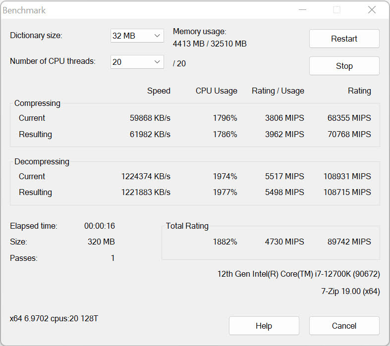 Populārajā 7-zip arhivatorā ir iestrādāts arī veiktspējas tests, kas ļauj labāk saprast, kādas ir konkrētā datora arhivēšanas un atarhivēšanas spējas. ASUS ROG STRIX B660-F GAMING WIFI te parāda pieticīgus 89 742 punktus.