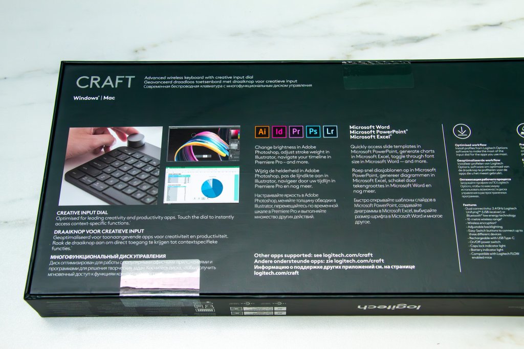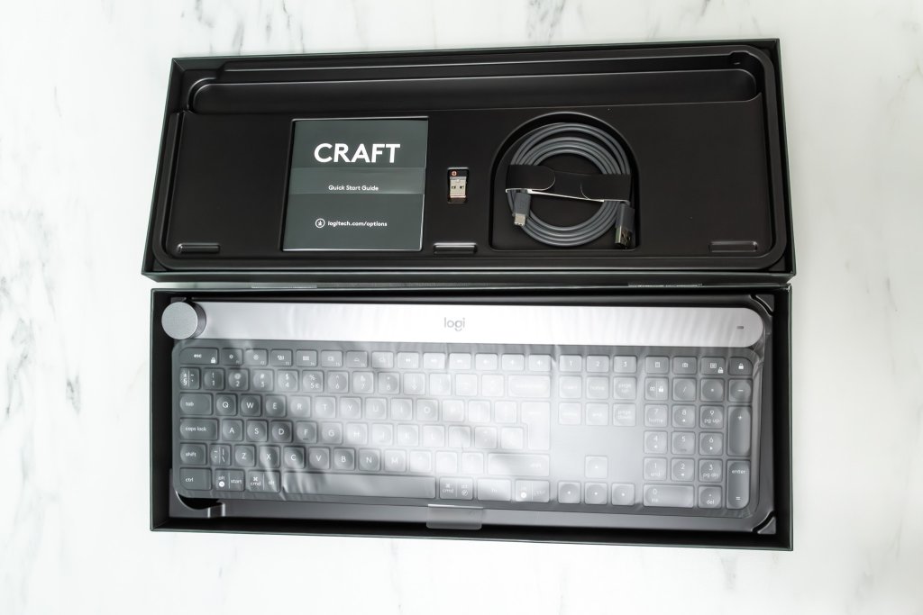 Logitech Craft piedāvā pilna izmēra tastatūras izkārtojumu ar ciparu bloku. Taustiņi ir viegli un ērti nospiežami, ar īsu atsitienu. Ierīcei ir arī fona apgaismojums, kas automātiski pielāgojas apkārtējās videi.