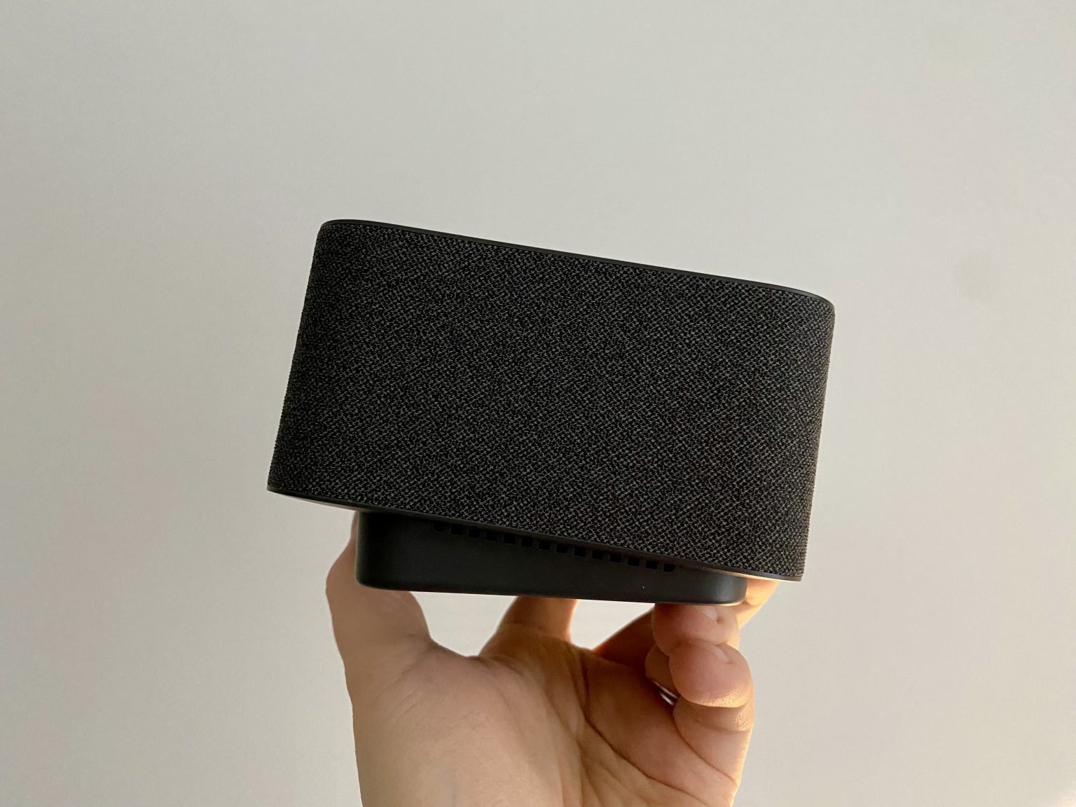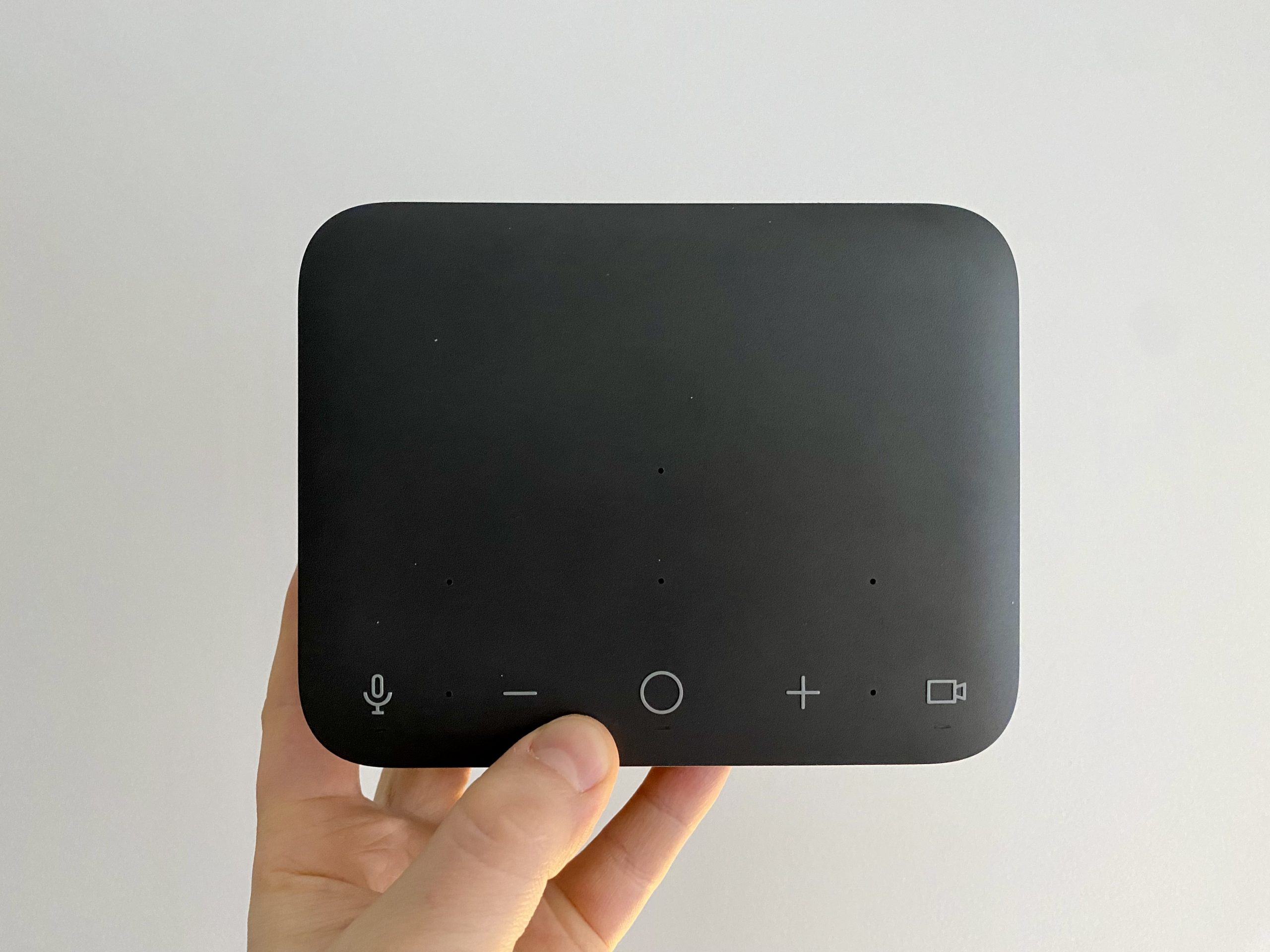 Ierīces augšpusē redzam daļu šīs dokstacijas maģijas. Ierīcē ir iebūvēti veseli seši mikrofoni un izskatās, ka tie ir paslēpti zem tāda paša skaita caurumiņiem dokstacijas virspusē. Gan iekrāsoti, gan piepacelti izceltas ir vairākas skārienjūtīgas pogas ar kurām varam kontrolēt dokstaciju un attiecīgi arī mūsu iecienīto videokonferenču lietoni. Sertificētas ir Microsoft Teams, Google Meet, Google Voice un Zoom, taču dokstacija darbosies arī ar citām saziņas lietotnēm.