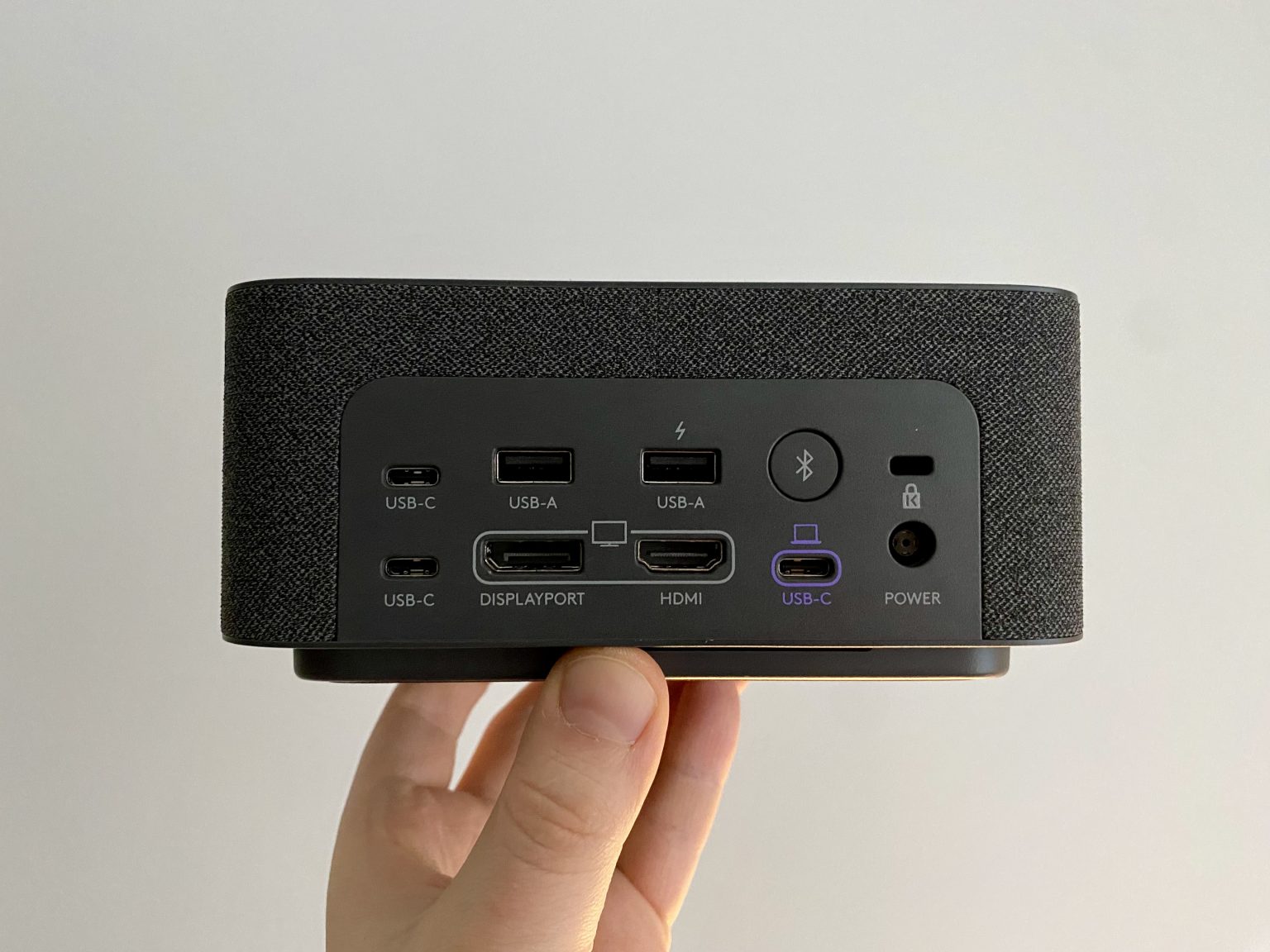 Mums tiek piedāvātas divas USB-A pieslēgvietas un divas USB-C pieslēgvietas (trešā ir ierīces sānā). Ceturtā USB-C pieslēgvieta (iekrāsota violeta) paredzēta savienojumam ar datoru. Jāpiezīmē, ka Logi Dock nenodrošina Thunderbolt standartu. Pie galda varam šo ierīci droši pieslēgt izmantojot Kensington slēdzeni un barošanas portā varam iespraust spraudni no komplektā iekļautā barošanas risinājuma. Interesanta ir Bluetooth poga – tā ļauj pie dokstacijas pieslēgt, piemēram, mobilo telefonu un tad varēsim sazvanu veikt izmantojot dokstacijas mikrofonus un skaļruņus.