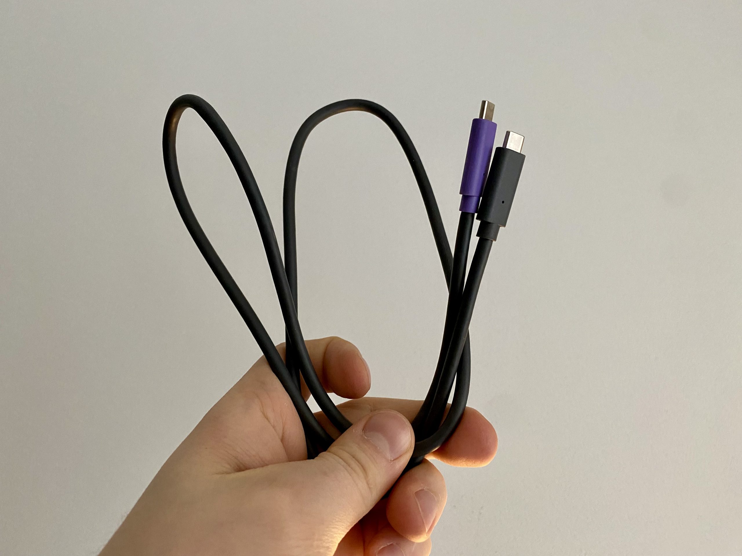 Bez pašas dokstacijas iepakojumā atradīsim arī vairākus kabeļus. Datu pārraides kabelis ir 1m garš un abos galos tam ir USB-C tipa spraudņi. Attiecīgi, tieši šāds ports dokstacijai aizmugurē ir savienojumam ar datoru (iekrāsots violets tāpat kā viens kabeļa spraudnis) un arī datora pusē mums vajadzēs USB-C pieslēgvietu.