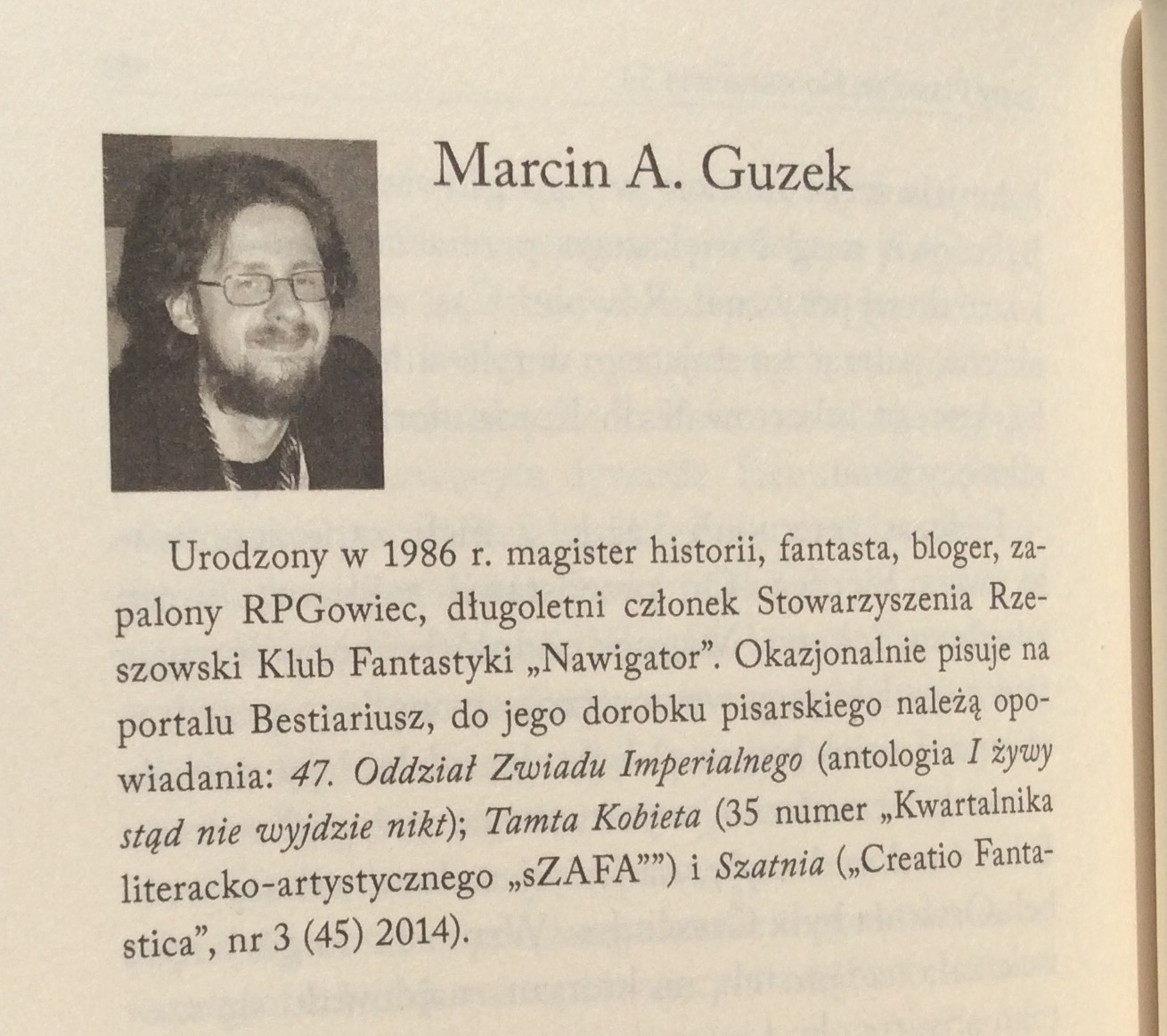 Dzimis 1986. gadā. Viņam ir vēsturnieka izglītība. Fans, emuāru autors, dedzīgs RPG cienītājs, ilggadējs zinātniskās fantastikas kluba „Nawigator” loceklis Žešovā un aktīvs tīkla portāla „Bestiariusz” loceklis.