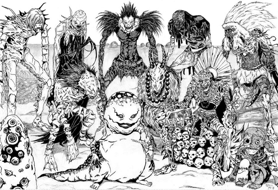 Šinigami japāņu mitoloģijā bija nāves dievi. Viņus raksturo kā dēmonus, kritušos eņģeļus vai pat pašu nāvi. Budismā Šinigami ir cilvēku apsēsts dēmons, liekot viņiem vēlēties izdarīt pašnāvību. Viņi arī pieņēma lēmumus par to, kuri cilvēki mirs un kuri nē.