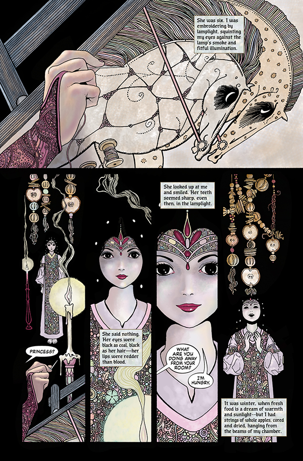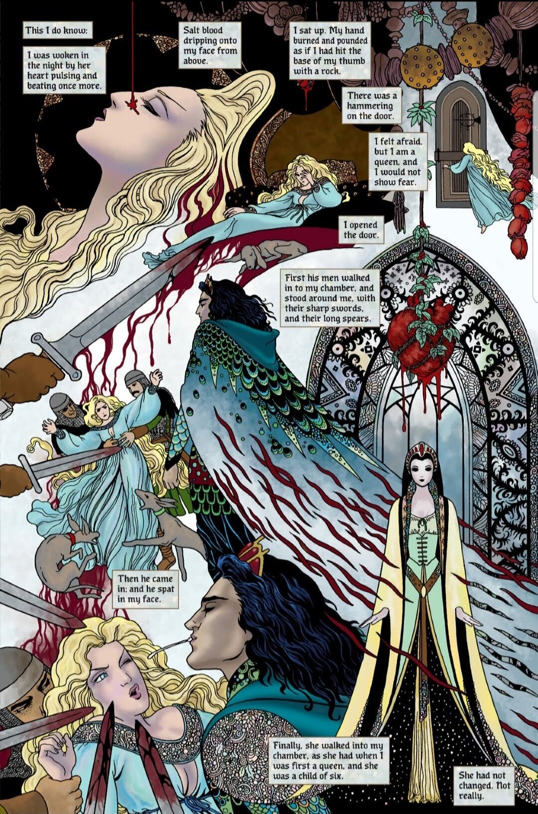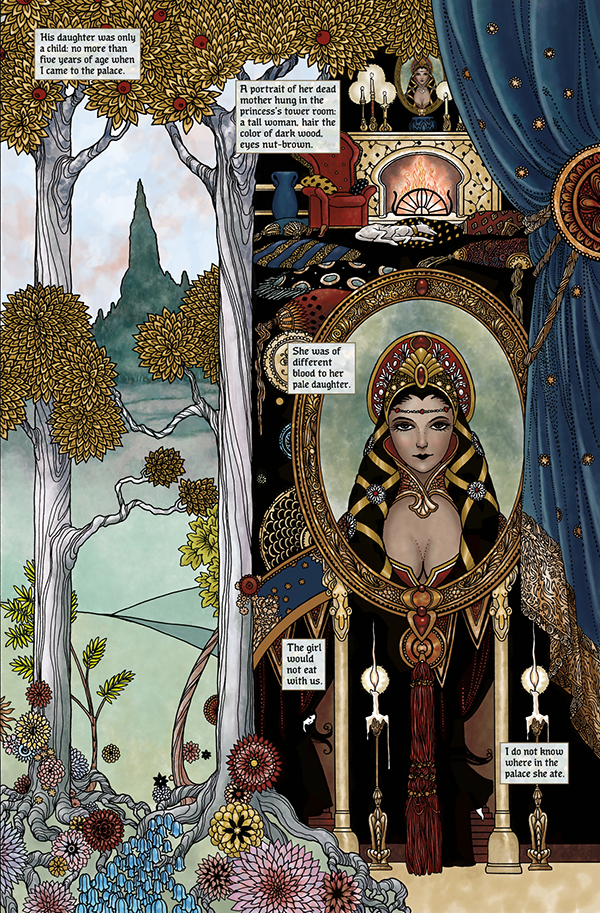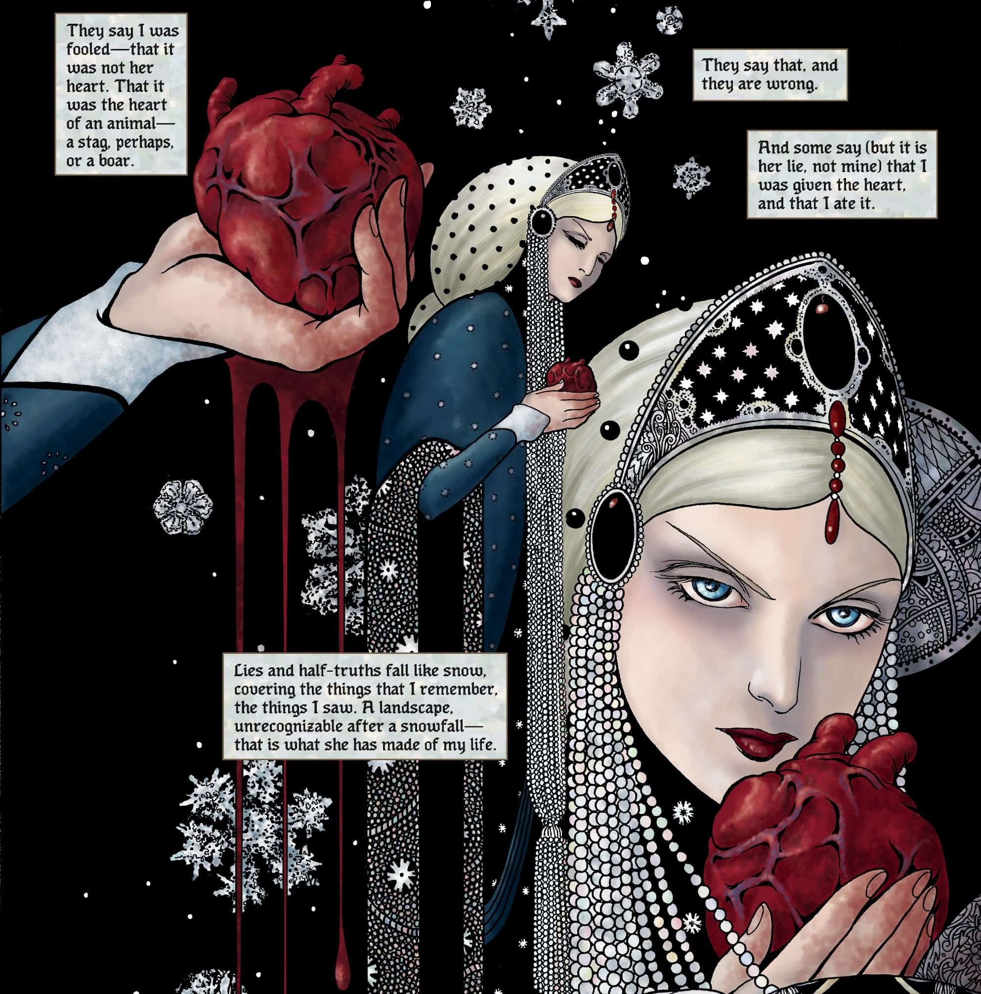 Pamātei jau no mazotnes piemīt maģiskas spējas, tostarp nākotnes vīzijas. Viņa apprecas ar karali un viņa meitu Sniegbaltīti raksturo kā noslēpumainu, vampīrisku jaunu meiteni. Karalis galu galā mirst no sešgadīgās Sniegbaltītes fiziskas un seksuālas vardarbības un atstāj pamāti valdīt kā karaliene. Pamāte liek saviem medniekiem noslepkavot Sniegbaltīti un izgriezt viņas sirdi, kas joprojām pukst pat pēc izņemšanas un tiek pakārta karalienes privātajos kambaros. Pēc liela skaita pazušanas un slepkavību valstībā karaliene izmanto maģiju un savas asinis, lai radītu apburtus ābolus, kurus viņa ienes mežā joprojām dzīvajai Sniegbaltītei.
