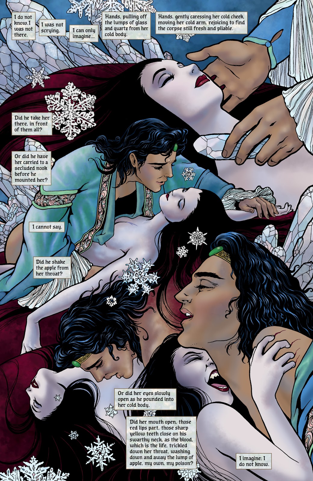 Karaliene bēg, bet zina, ka radījums ēda ābolus, kad Sniegbaltītes izņemtā sirds beidzot pārstāj pukstēt. Divus gadus vēlāk karalieni apciemo princis, un viņa plāno ar viņu apprecēties un apvienot viņu karaļvalsti. Tomēr karaliene nespēj seksuāli apmierināt princi, kurš nepārprotami ir nekrofils, un viņš aiziet. Mājupceļā viņš sastopas ar Sniegbaltītes mirušo ķermeni, kuru apsargā septiņi rūķi. Izbaudot savu nekrofiliju, princis izvaro Sniegbaltīti un negribot izspiež Sniegbaltītes rīklē iestrēgušo ābola gabalu, atdzīvinot viņu. Princis un Sniegbaltīte atgriežas karalienes valstībā un piespriež viņai nāvessodu par burvestību. Karaliene tiek sadedzināta krāsnī, un atklājas, ka stāsts ir viņas pēdējās domas, kad viņa sāk degt līdz nāvei.