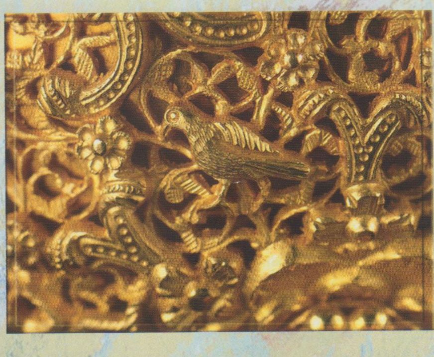 Šis mākslas darbs ir pilnīga pretruna un paradokss. Tas piesaista ar savu pasakaino skaistumu un vilina ar savu greznību. Lieliskais futlāris, kas izgatavots no tīra 22 karātu zelta, atrodas uz trīs kāju statīva, kuram katra kāja ir izrotāta ar pērtiķi, kuram ir spārni. sarežģītais dizains ir pārsteidzošs ar savu meistarību, un uz tā attēlotās mītiskās būtnes ir vienradži, grifi un pērtiķi ar spārniem. Vāku grezno karaliskā putna figūriņa. Futlārī iekšā glabājas īsts dārgums.