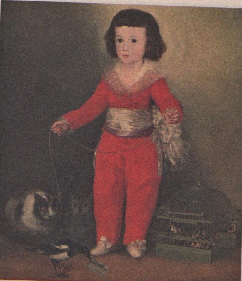 Uz Francisko Goijas gleznas “Dons Manuels Osorio Manrike de Suņiga, bērns”, kura uzgleznota aptuveni 1787. gadā, atainoti, vispār, bērns, vārna, būris un trīs kaķi. Pie kam pats bērns, putns un būris izskatās pieņemami prezentatīvi, bet lūk kaķiem atklāti demoniski purnu izskati. Noerikti te neiztika bez svētās inkvizīcijas ietekmes, ar kuru māksliniekam visu laiku radās konflikti uz glezniecības pamata.