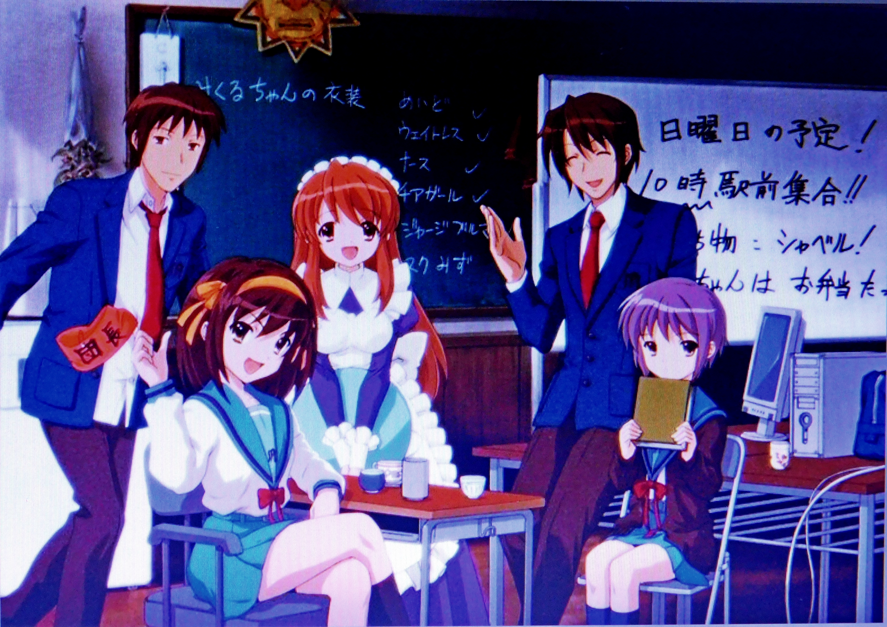 - Visa SOS komanda pilnā sastāvā. No kreisās: Kjons, Haruhi, Mikuru, Icki, Juki.