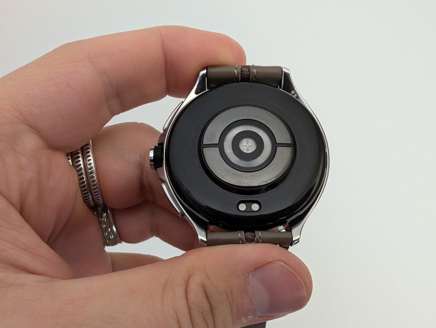 Pulksteņa apakšpusē redzam bezvadu uzlādes kontaktus, kā arī vairākus sensorus. Ierīce no sensoriem ir saņēmusi optisko sirdsdarbības sensoru, bioelektriskās pretestības analīzes sensoru, akselerometru, barometru, gaismas sensoru, digitālo kompasu un žiroskopu. Tādējādi ar šo pulksteni varam ne tikai uzskaitīt mūsu soļus, bet arī mērīt pulsu, ķermeņa temperatūru, skābekļa daudzumu asinīs un analizēt miegu. Tātad – ļoti plašas iespējas.