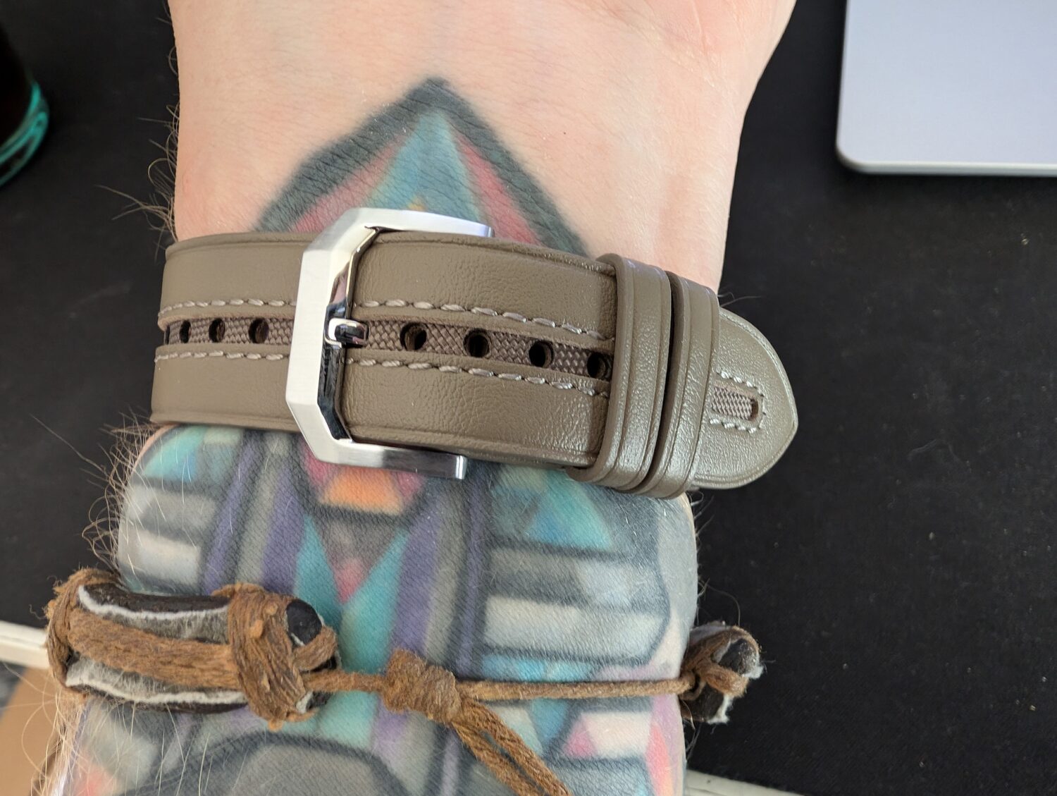 Lai arī man izturīgākas šķiet magnētiski stiprināmās siksniņas, kādas izmanto, piemēram, Apple Watch viedpulksteņos, Xiaomi savu produktu izvēlējies apveltīt ar plašāk pieejamu siksniņu tipu. Man grūti pateikt vai šī ādas siksniņa ir veidota no īstas ādas, taču vismaz smarža par to liecina. Siksniņa izveidota kvalitatīvi un liela uzmanība pievērsta arī precīzam un smalkam šuvumam. Sākotnēji šī ādas siksniņa man šķita pārlieku cieta un neelastīga, taču jau pēc pāris dienu valkāšanas tā sāka ieņemt rokas formu un to vairs neuzskatu kā problēmu.