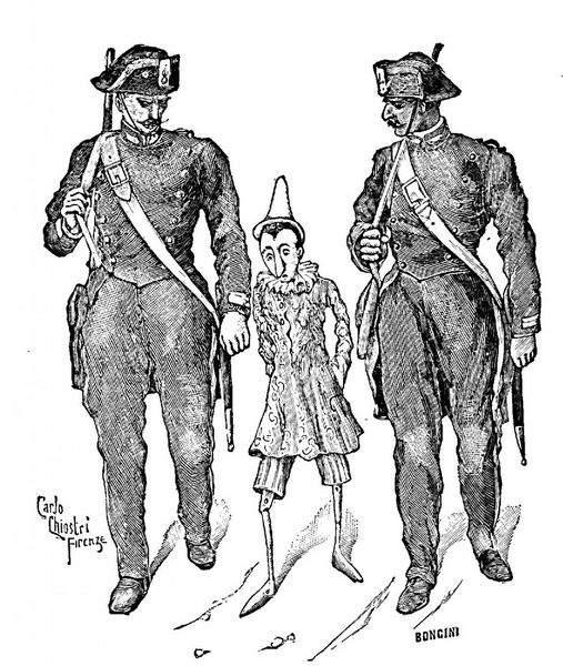 Ar aptuveni šādiem vārdiem rakstnieks un žurnālists Karlo Lorencīni, plašāk pazīstams ar pseidonīmu Kollodi, 1881. gadā nodeva Bērnu laikraksta (Giornale per i bambini) redaktoriem pasakas Lelles vēsture (Storia) manuskriptu. di un puppe). Viņa sarunu biedrs bija laikraksta redaktors un direktors Ferdinando Martini.
