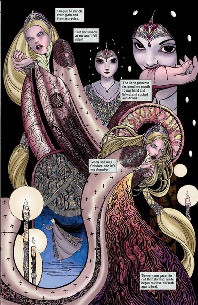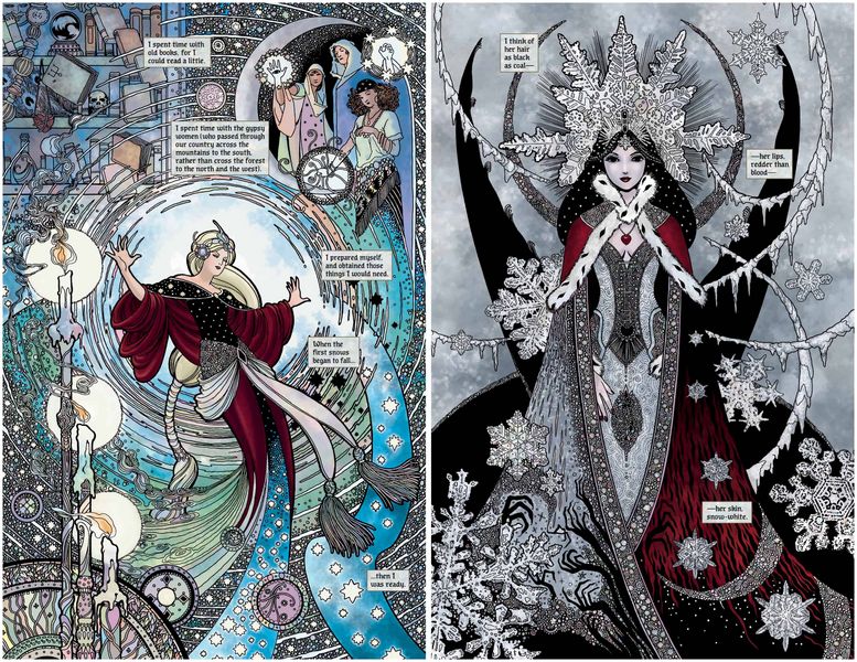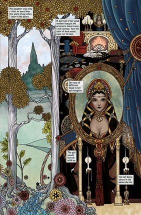 Pamātei jau no mazotnes piemīt maģiskas spējas, tostarp nākotnes vīzijas. Viņa apprecas ar karali un viņa meitu Sniegbaltīti raksturo kā noslēpumainu, vampīrisku jaunu meiteni. Karalis galu galā mirst no sešgadīgās Sniegbaltītes fiziskas un seksuālas vardarbības un atstāj pamāti valdīt kā karaliene. Pamāte liek saviem medniekiem noslepkavot Sniegbaltīti un izgriezt viņas sirdi, kas joprojām pukst pat pēc izņemšanas un tiek pakārta karalienes privātajos kambaros. Pēc liela skaita pazušanas un slepkavību valstībā karaliene izmanto maģiju un savas asinis, lai radītu apburtus ābolus, kurus viņa ienes mežā joprojām dzīvajai Sniegbaltītei.